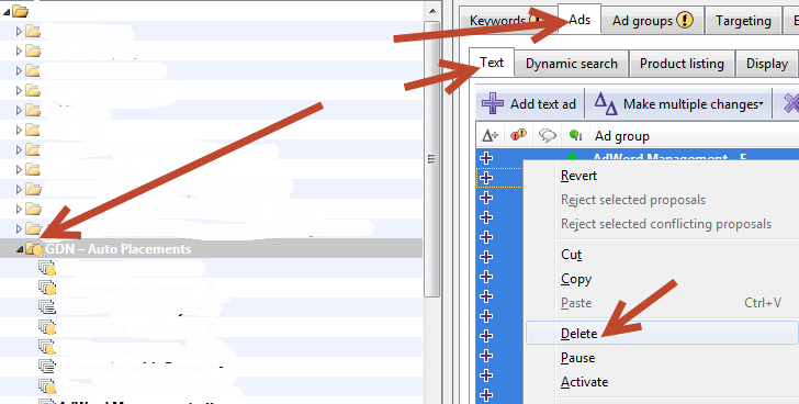 7. Delete all the text ads which will have been copied into the campaign by going to the ads tab when you are at the top level campaign name, select all and then delete: